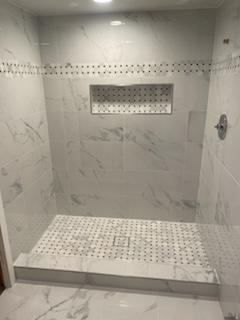 A series of images presenting modern bathroom remodels with marble tiles, chrome fixtures, frosted glass shower doors, and mosaic accents. The projects also include vanities, mirrors, and glass showers.
